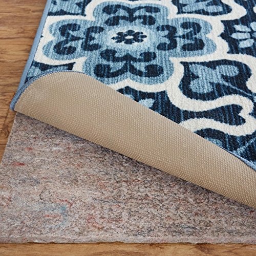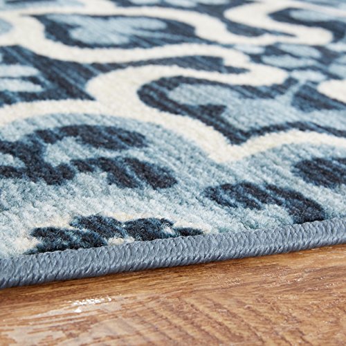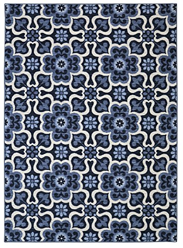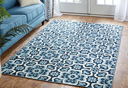 Patterned after traditional tile artistry, the Marjorelle Gardens is another to play with the trend of Moroccan art. Crafted in cool colors of indigo, aqua and sand, this one reminds us of the beauty that lays on and off the Mediterranean coast. The Marjorelle Gardens rug is constructed of 100% Mohawk Exclusive Wear-Dated Nylon, a premium fiber that promises proven wear-free performance, and is reinforced by our durable latex backing for a quality you can trust. Printed on the same machines that manufacture one of the world’s leading brands of printed carpet, this rug is extremely durable and vibrant. This technology allows the use of multiple colors to create a rug that is wonderfully designed and applicable to any room in your home. With this gorgeous transitional style and ornamental pattern, this rug's pile height is 10/32 in high. Remember to keep the pile and fabrics in tip top shape. Area rugs should be spot cleaned with a solution of mild detergent and water or cleaned professionally. Regular vacuuming helps rugs remain attractive and serviceable. Only the best quality materials will do. This rug is printed with a level loop pile on Wear Dated 100% nylon, backed with latex. Made in USA.Feature