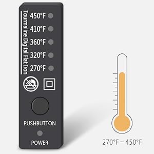 最初にオン/オフを押すと、電源と温度インジケータが点灯し、温度が設定値に達すると電源インジケータが消灯し、すべてのインジケータが消灯するとフラットアイロンがオフになります。 毛の質に応じて安全な温度をお勧めします:一般的な毛髪(<=80μm)、粗毛(>80μm)は細かい毛髪(<=60μm)、360-410F、410-450Fで270-360Fです。 PTCサーモスタットヒーターは温度を自動的に制御して燃焼を防ぎ、髪に快適な温度を与えます。