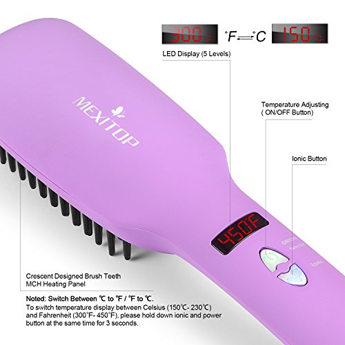 - 4 In 1 Functional Straightener Styling Brush Comb, 4 Different Models in 1 Powerful Beauty Weapon: A brush, the crescent shape fitting for head form and lead-in teeth, perfect for your less, long or fringe. A ionic brush, helps to get your hair more smooth with less hair knotting. MCH Heating for hair straightening. You can also use these function at 1 time for your hair styling. No more need to bring your brush, straightening iron but only a MEXITOP Crescent Brush.