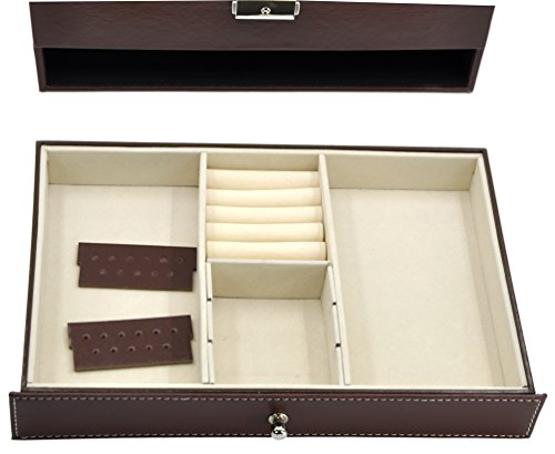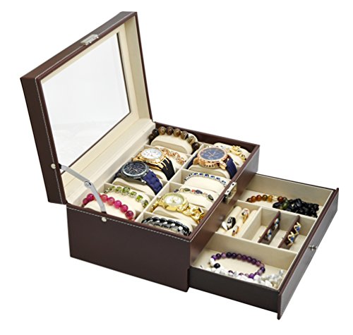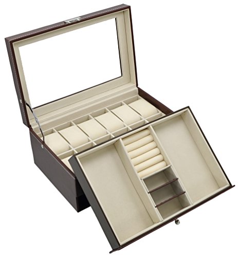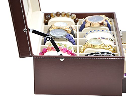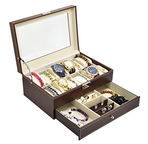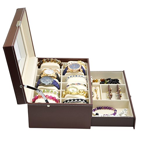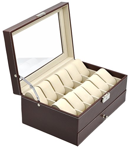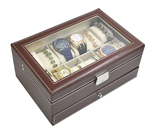 -. Title : Jewelry Watch Box Watch Organizer 12 Slots with Drawer Lockable PU Leather Jewelry Display Storage Brown