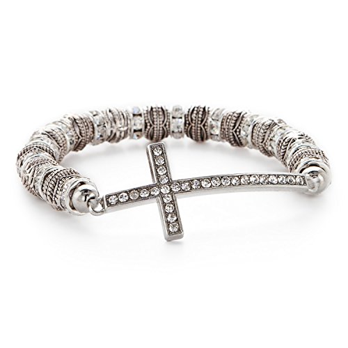 Faith and fashion make a fun combination in this bracelet. With its comfortable on and off stretch design, this bracelet also manages to sport a lot of stylish class with its pave crystal cross, oxidized and textured silver tone beading and eye-catching crystal rondelles. Slip it into that next arm party and have a shining style that's all your own. Bracelet measures 7" around and .8" wide. The cross measures 1.75" long and .8" wide. Arrives gift boxed!Feature