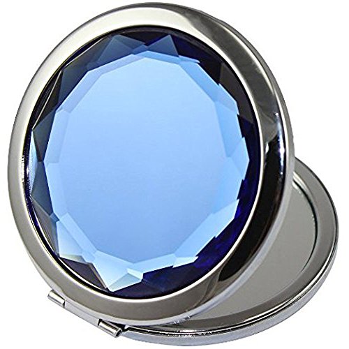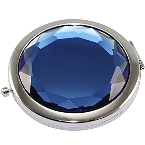 ADAMAI Crystal Folding Makeup Mirror Handhold Metal Round Hand Compact Pocket Cosmetic Magnified Mini Mirror (blue)