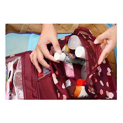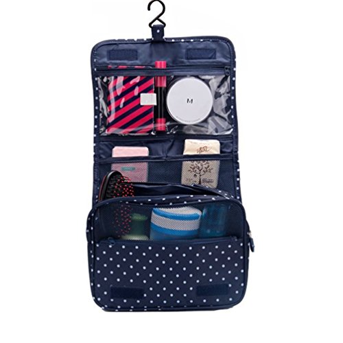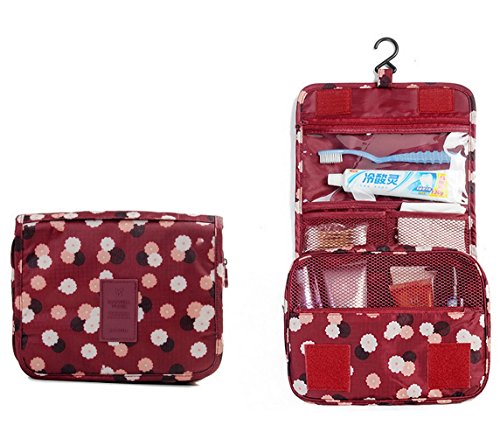 - Stores all your Toiletry / Cosmetic needs in one bag - This hanging Cosmetic Bag is made of high density Nylon which is waterproof, durable and scent free - Measures 9.4" L x 7.4" W x 2.8" H . - Fits travel size and normal size toiletries in netted pockets - Easily stored into your check-in Luggage - Hook is sewn securely to the inside of the bag - Can be hung on the towel rack, behind the bathroom door or inside a cupboard