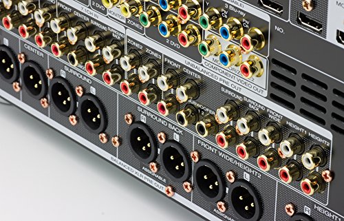 -. Feature : 11.2ch platform. Audio: Front 1in, Rear 5in and Phono in, Video: CVBS Front 1 in, Rear 3 in /1 out, Component 2 in /1 out (Gold plated). 13.2ch(RCA)/11.2ch(XLR) Preout (Gold plated) / 3-zone/3-source via variable pre-outs and Amplified zone / 4K full-rate pass through and HDCP2.2 / Dolby Atmos, dts UHD and Auro 3D upgradability / Audyssey MultEQ XT32 setup with MIC stand included in the box / Dynamic EQ & Volume
