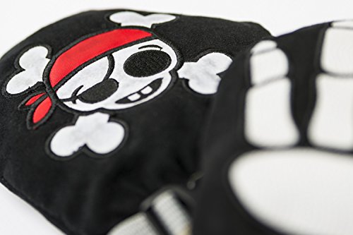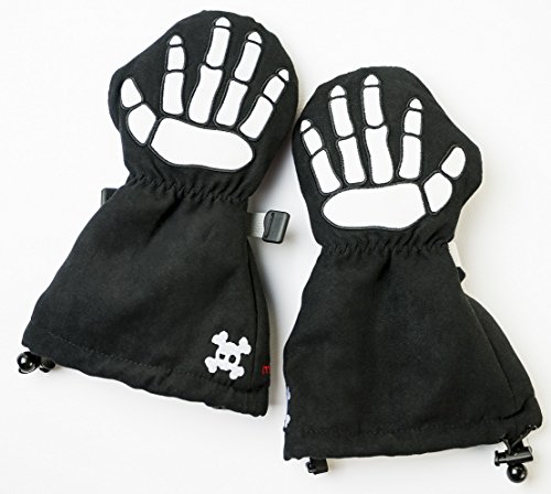 Product Description Nobody like frozen fingers. Keep your little pirate's hands warm to the bone in our Skully Mittyz! End the "thumb wars" and tame the winter cold! We like to say these are "The Best Kid's Gloves on the planet." Specially designed winter gloves for children ages 6 and under. Oversized gauntlet to fit over the largest coat sleeves. Elastic gauntlet cinch strap to seal out snow and ice. Double pull wrist strap for quickly securing the glove on children's hands. Quick release wrist buckle for easy removal after outdoor play. Integrated thumb pocket for ease of putting on. Easily reversible for quick drying. Fleece lined inside. Machine wash and dry. Great for children with special needs or disabilities. 0