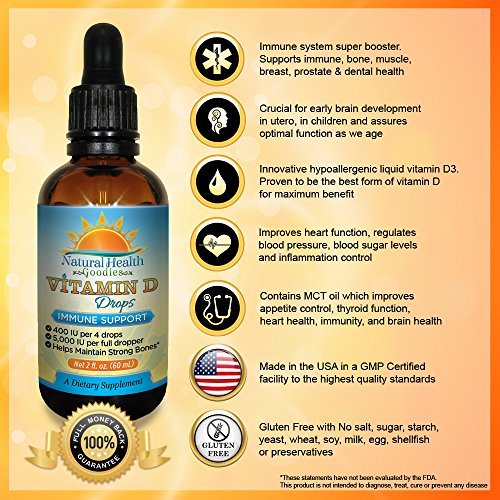 Daily vitamin D use helps support a healthy immune system, bone and tooth development. See images above. These concentrated vitamin D drops come in optimal bio available liquid form for fast absorption in the body. You have better things to do with your time than wait AGES for a single drop to fall from other brands of Vitamin D3 Drops, or worse overdose if the drops come out too fast. Our easy to dose bulb-dropper let's you choose how much D3 each member of your family needs from 100 IU to 1000, 2000, 5000IU or anything in-between. This means you get the right amount of immune boosting goodness. Conveniently adjust the dosage for infants, babies, children, men or women. One drop for 100IU or a full dropper provides 5000 IU of vitamin D liquid ( cholecalciferol ). Made in the USA in a GMP certified facility for highest quality standards. Wheat, gluten, soy, milk, egg, sugar, salt, yeast, shellfish, preservative and gluten-free. Give your family a boost of good health. Order your d-drops today!Feature