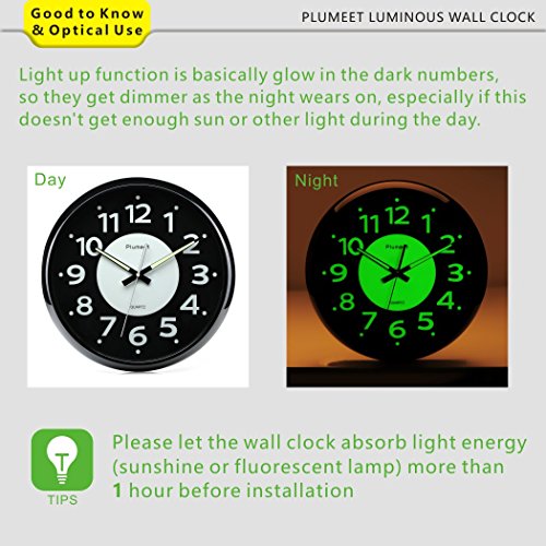 -. Feature : Plumeet Glowing Clock Advantage: night lights function & long light up time, super quiet & non-ticking, come with a hanging hook, large enough numbers perfect for the elderly or the visually restricted people. / Long Light up Time -- More than 2 hour light up time powered by a built-in high quality absorbent material, extra luminous area makes it easier to read the hour and minute hands; of course this night light function asks for absorbing enough light energy (sunshine or fluorescent lamp) during the day. / Accurate & Quite -- Quiet quartz movement to guarantee accurate time, quite & non-ticking sweep second hand, ensure a good sleeping or working environment. / Easy Install -- It is easy to put up as it comes with a cleverly designed hook with already installed brads, no messy drywall dust or plaster on the ground from screwing or hammering in typical anchored hooks. / High Quality -- Environmental friendly ABS materials and Energy-saving movement, powered by 1 x AA battery - not included (a good battery can be used for more than one year, energy saved).