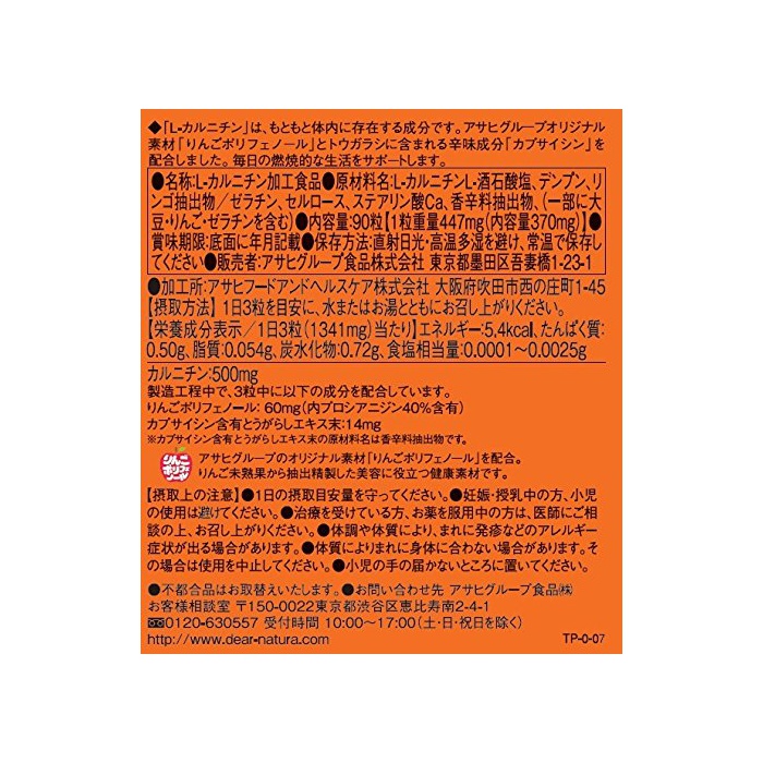 제품 개요 : 느끼한 것이 대좋아하는 분에.연소 적인 생활을 서포트 하는 L-카루《지닌》에,아사히맥주 그룹 오리지날 소재 사과 폴리 phenolic와 캡사이신을 배합했습니다.