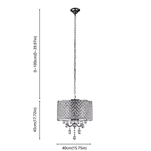 Hanging chain is adjustable, Max 39.37inch. Fixture diameter is 15.75in, fixture height is 17.72in.