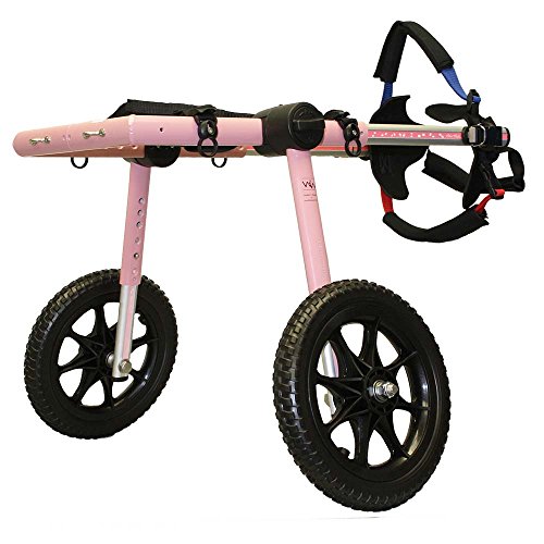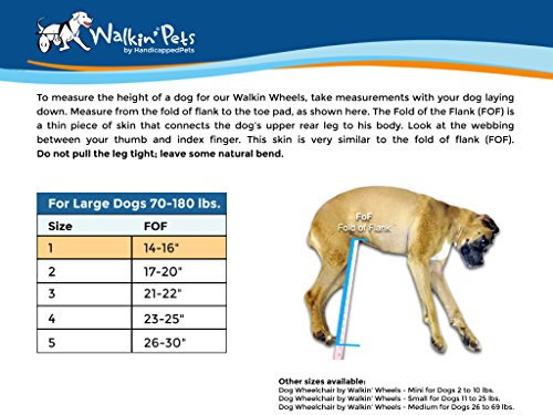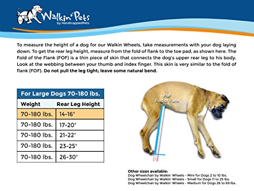 Studio : HandicappedPets.com Publisher : HandicappedPets.com Binding : Misc. Product Description Dog Wheelchair - For Large Dogs 70-180 lbs - By Walkin' Wheels Size: 1 Our Walkin' Wheels dog wheelchair is constructed with high quality aluminum that is designed to not bend, break or rust and then a powder coated finish is applied to add an extra layer of protection to your pets' wheelchair. After fitting one on your dog or other pet, they will be able to run and play again, get exercise, and live a happy, healthy life. Walkin' Wheels is a veterinarian approved canine cart designed to help pets with hip and leg problems including degenerative myelopathy (DM), hip dysplasia, arthritis, paralysis, slipped disc, soreness, spinal and neurological problems, surgical recovery, and more. Your dog will use his or her front legs to move, explore, and play, while the back legs are lightly touching the ground or safely held up in stirrups.