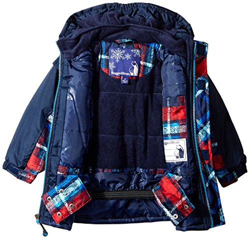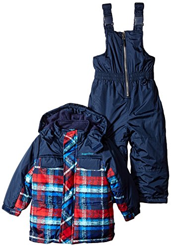 Two-piece set featuring solid-tone snowsuit and plaid coat with hood