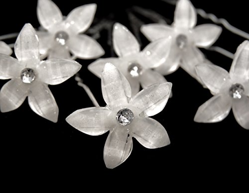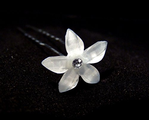 Sparkling white acrylic flower with crystal center hair pin. Great accessory to accent any hair style. Easy to place and remove. Great for wedding, party, pageant, prom, birthday, anniversary and other special occasions. The flower measures about 3/4 inch diameter, and the pin is 2 1/2 inches long. Carefully and beautifully packed in a BONUS white jewelry box with metallic tie.Feature