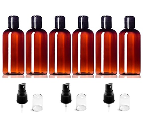 (Set of 6) Plastic Amber 4 Ounce Boston Round Empty Refillable PET Bottles ( BPA Free) Includes 3 Additional Sprayer Tops