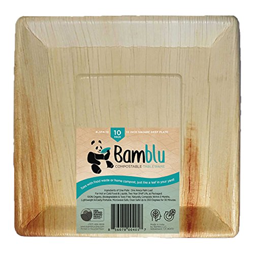 Studio : Bamblu Publisher : Bamblu Binding : Kitchen Product Description Bamblu palm leaf disposable plates are chic, cool and 100% self-sustaining, organic and biodegradable. Each plate will vary from light beige color to a dark brown color. For hot or cold foods, solids or liquids and lighter than bamboo or wood tableware, they're very sturdy holding up to 20 times their own weight. Ideal for portable camping gear, rv camping supplies, long hikes or a travel emergency kit in your car. Use for indoor or outdoor dining and picnics, buffet dining, snacks or hors d'oeuvres. Earthen palm leaf plates accentuate a wide variety of styles for wedding dinner menus, birthday party themes, and really should be on your tailgate party list after using, simply toss in the trash with food waste or home compost and produce nutrient rich soil within two to three months. Cows and sheep have been known to love them, too use of eco-conscious products underlines your commitment to eco-conscious living to your guests or your customers. Reusable, though designed for one use. May be gently washed with soapy brush and water. Do not immerse in water, dry flat upside down. Remember, it is a leaf cases are packaged in packs of ten (10) in food grade shrink film, protecting against warpage and have a two year shelf life, as packaged. Store in a dry location. Best practice is to keep packages sealed until ready to use. How they are made ~ when you see the Bamblu panda, you know your tableware is of consistent quality and shape as all are produced in one factory. If not harvested and made into disposable tableware, these palm leaves would likely have been collected and burned, polluting the air. A completely renewable resource, dry and fallen areca palm leaves are collected, pressure washed, scrubbed, sundried, and compressed. Finally, all are sterilized. Only water is used in the shaping and sterilizing process and nothing is added. Excess water is re-used for agriculture and leftover pieces of leaves are composted. Truly, from earth to table and back . 0
