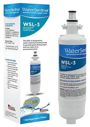 -. Binding : Misc. -. Brand : Water Sentinel -. Color : White -. EAN : 0785577904073 -. Feature : WQA Gold Seal Certified to NSF 42 / Economical alternative to expensive substitutes / Reduces sand, silt, sediment, rust, chlorine taste and odor that may be present in your drinking water / Designed to provide up to six months of life or 300 gallons / Proudly Manufactured in America with US based customer service -. Label : Water Sentinel -. Manufacturer : Water Sentinel -. Model : WSL-3 -. MPN : 102504 -. NumberOfItems : 1 -. PackageQuantity : 1 -. PartNumber : 102504 -. ProductGroup : Home Improvement -. ProductTypeName : MAJOR_HOME_APPLIANCES -. Publisher : Water Sentinel -. Size : 1-Pack -. Studio : Water Sentinel -. Title : WaterSentinel WSL-3 Refrigerator Replacement Filter: Fits LG LT700P Filters -. UPC : 705105832050 -. Warranty : 90 Day warranty against manufacturer defects from date of sale with invoice. For Customer Service call 866-218-8473