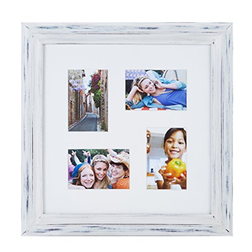 -. Feature : This collage holds two 4x6 and two 6x4 inch photos / Beveled mat into double mats with distressed white finish / A great way to display your happy memories / Made from wood / Frame measures 19.2x0.78x19.2 inches