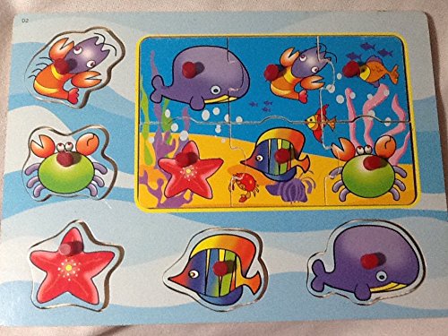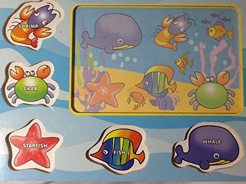 -. Feature : 11 piece sea creatures peg puzzle / Features starfish, crab, shrimp, 2 fish, whale, / Colorful pieces have red plastic pegs / Ready to ship!
