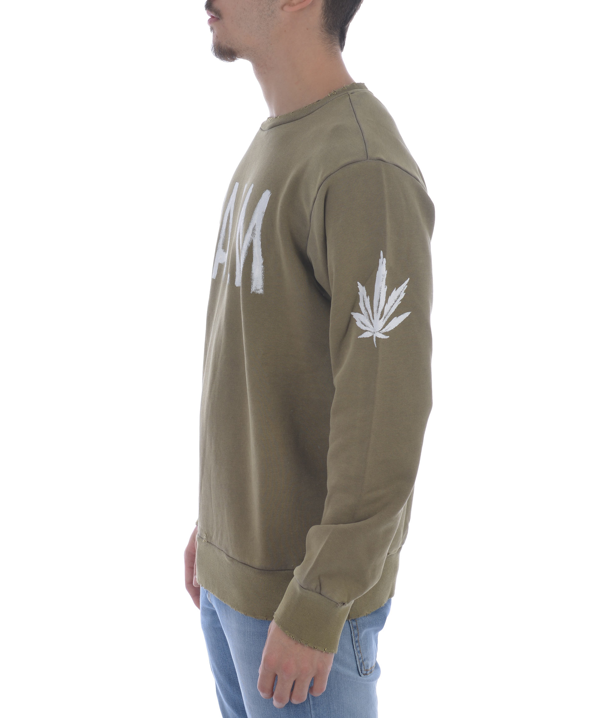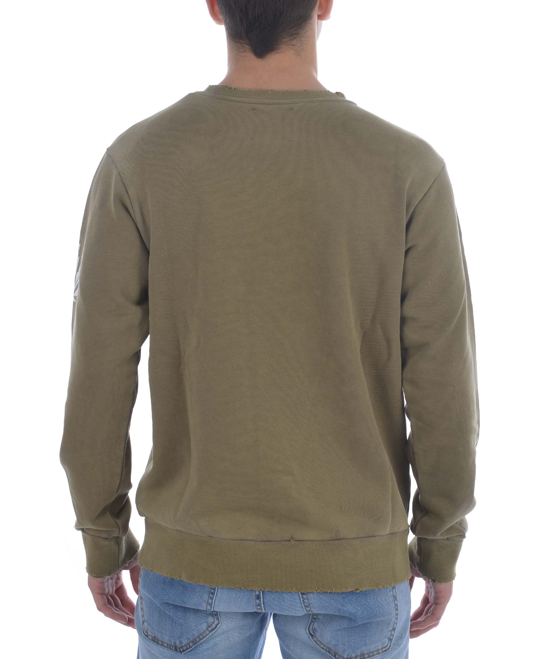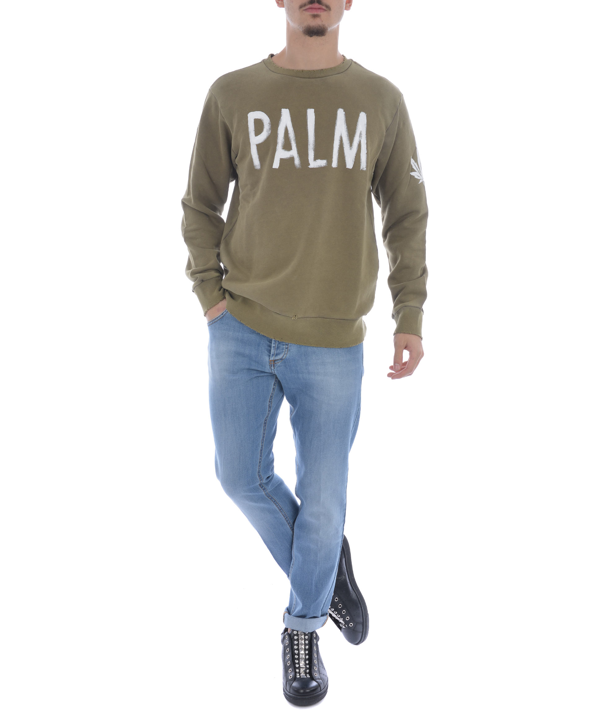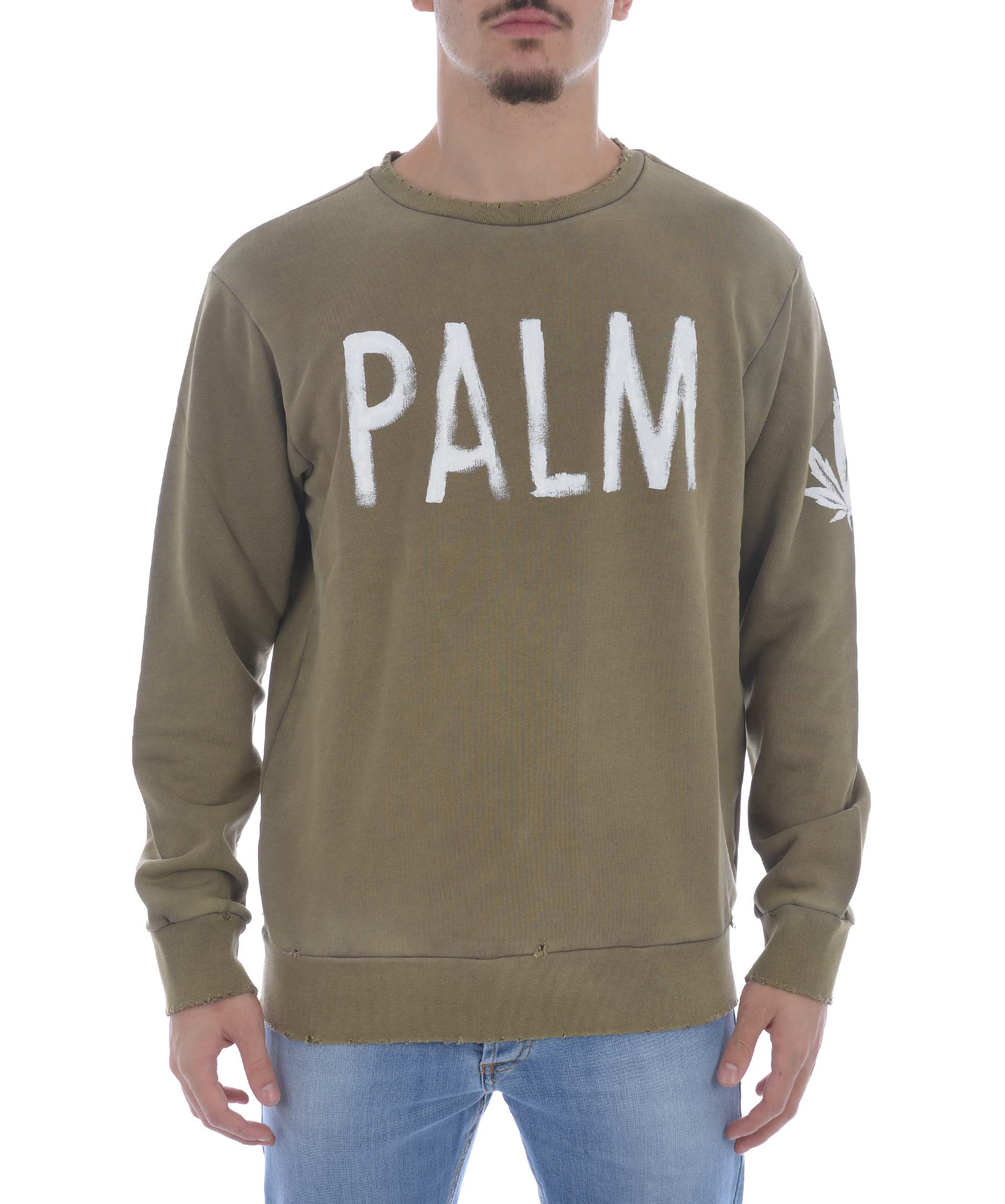 Felpa Palm Angels in cotone stretch Verde militare. Effetto used. Aree scolorite e rotture lungo i bordi. Stampa logo frontale e sulla manica sinistra effetto vernice. Girocollo a costine. Manica lunga. Polsi e fondo a costine.