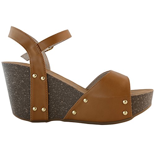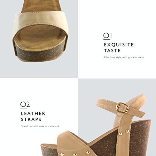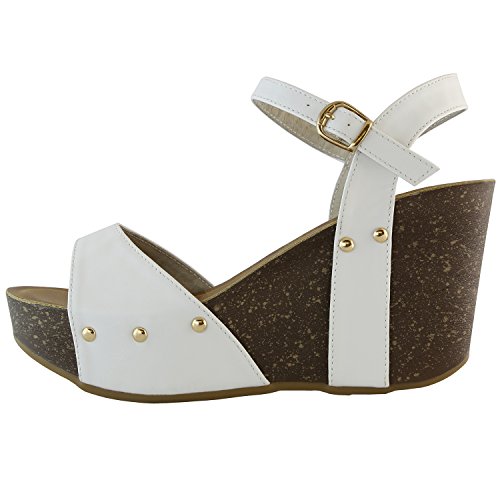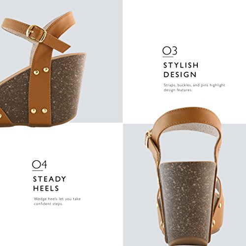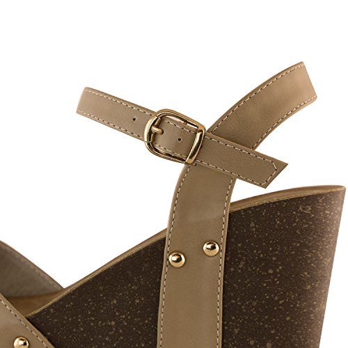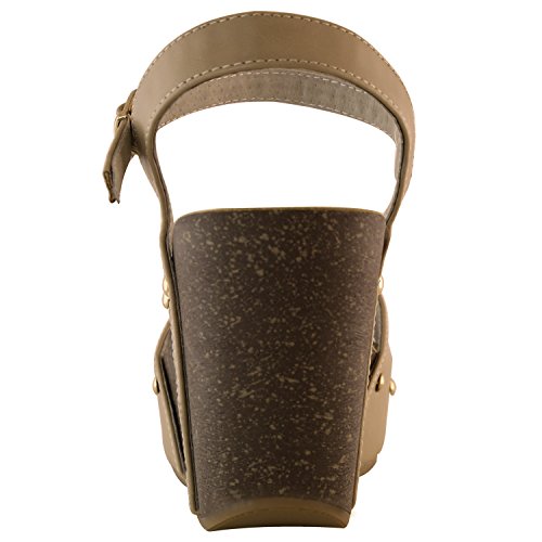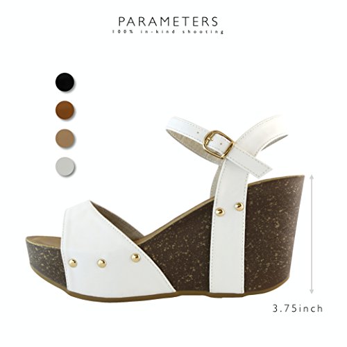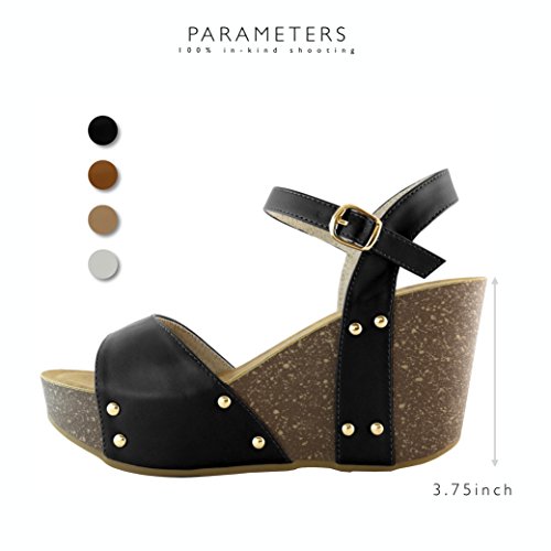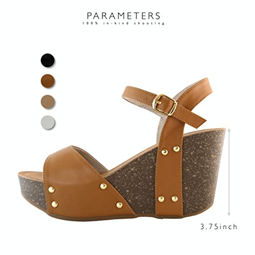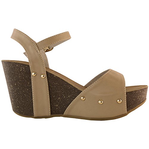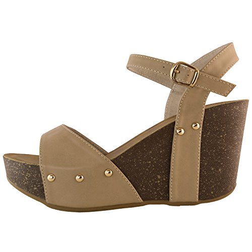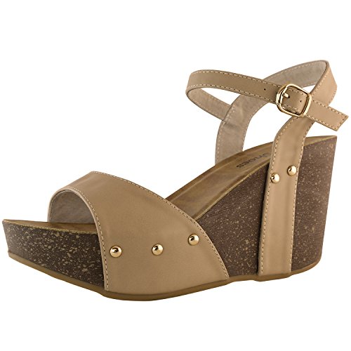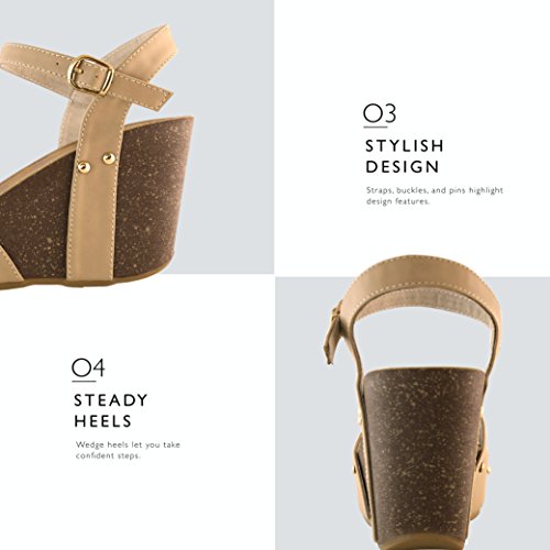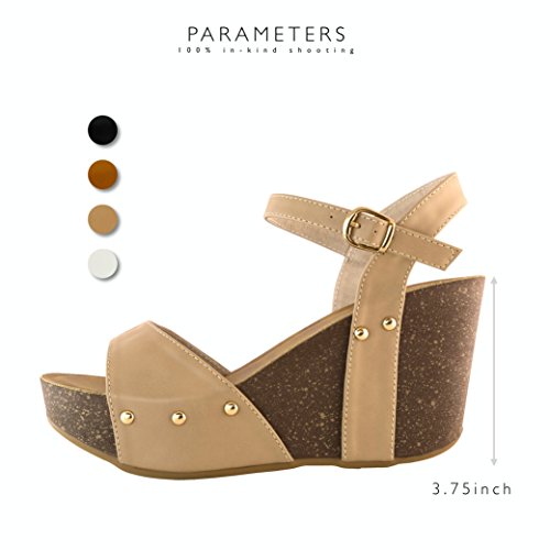 DailyShoes Chunky Cork Board Wedge Heels - 3.75 Inch Heel - Golden Tones Stud Embellishments - Unique Corkboard Style Design - Perfect for Casual Day or Nightwear