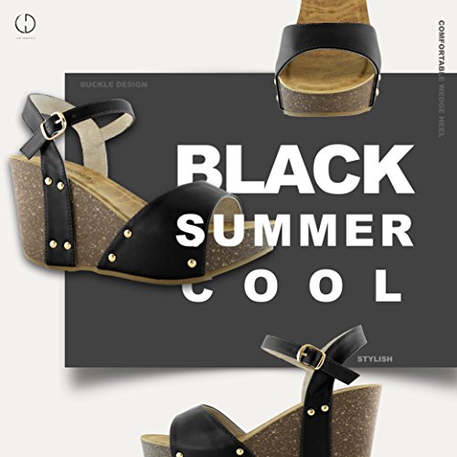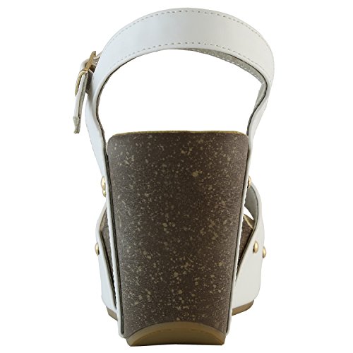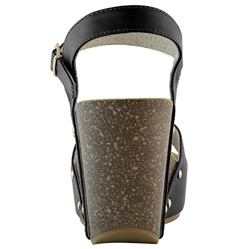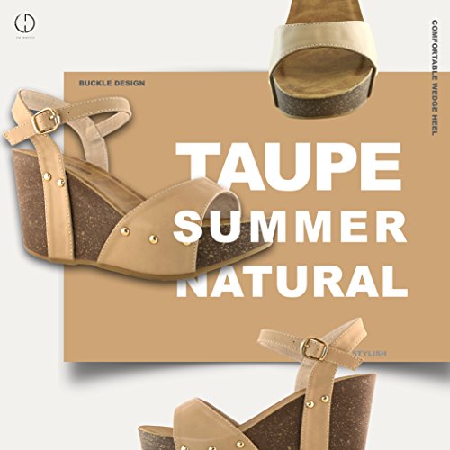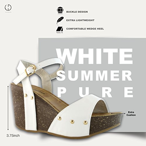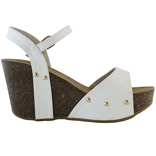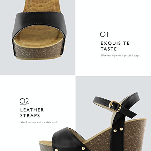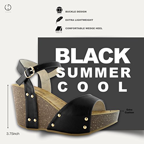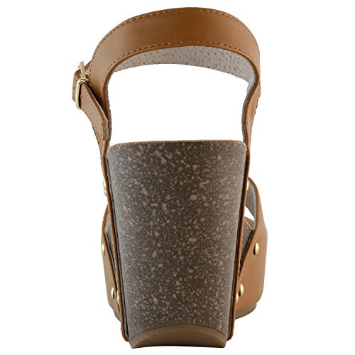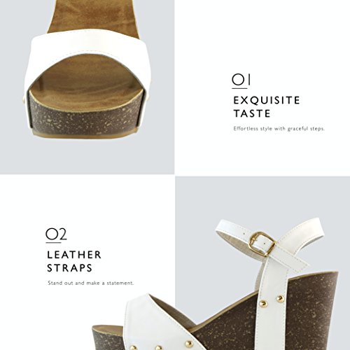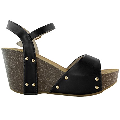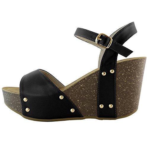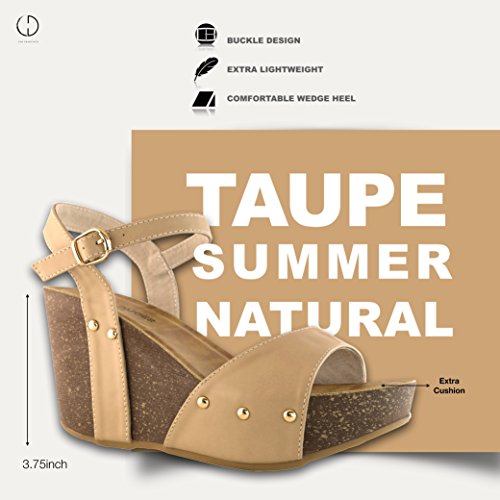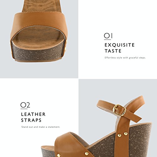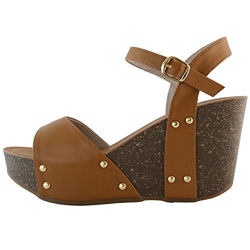 DailyShoes Chunky Cork Board Wedge Heels - 3.75 Inch Heel - Golden Tones Stud Embellishments - Unique Corkboard Style Design - Perfect for Casual Day or Nightwear