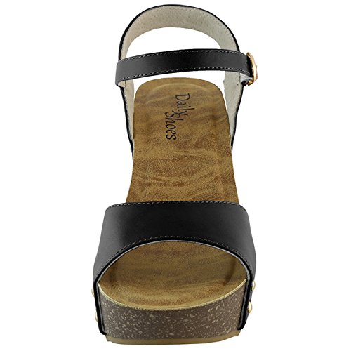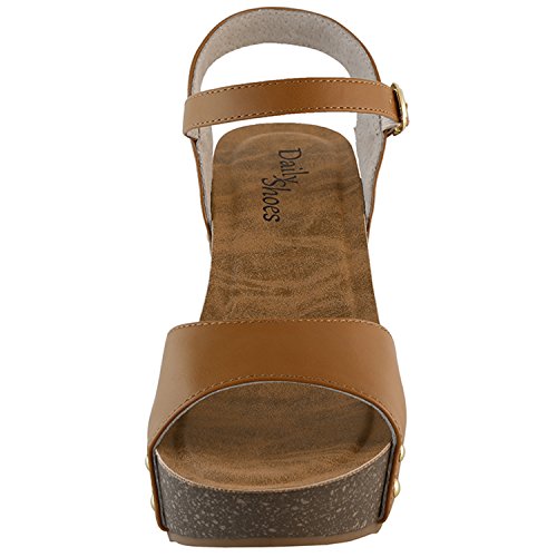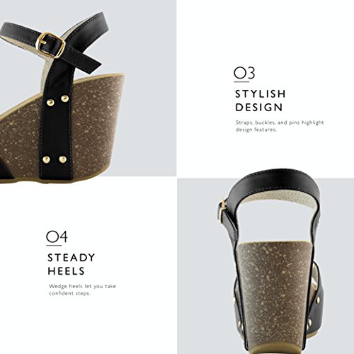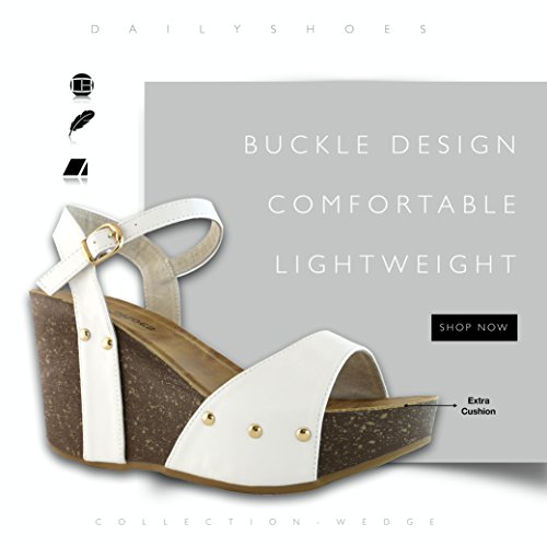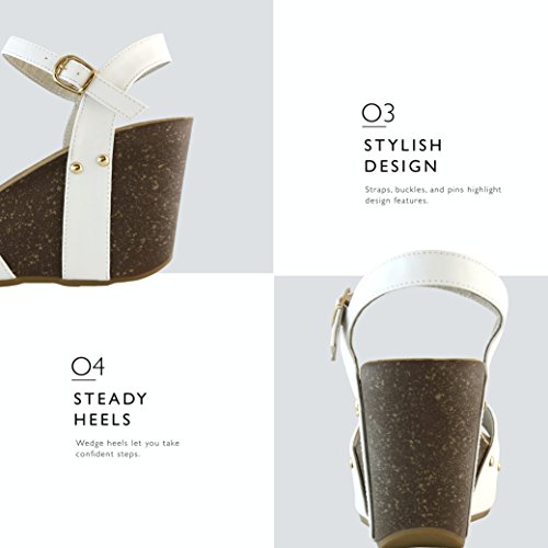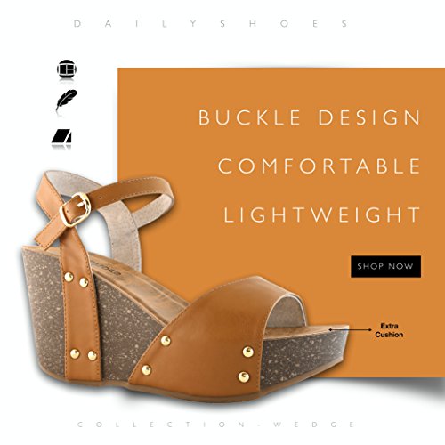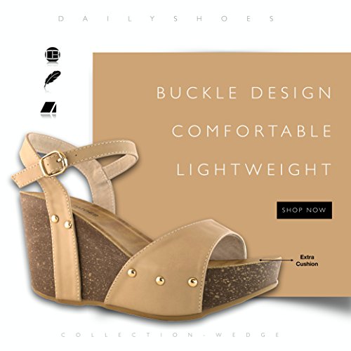 The DailyShoes Chunky Cork Board Wedge Heels feature straps around both the toes and the ankle as well as a secured strap around the top of the foot. This last strap comes with a durable buckle closure that keeps the shoes in place, while golden metallic studs of the same color and material adorn the sides of the shoe. 0 |