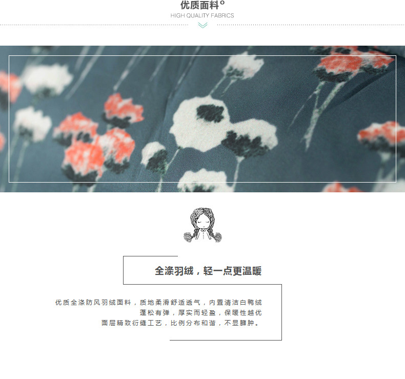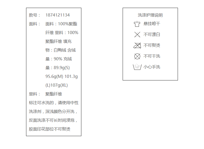 面料:100%聚酯纤维 里料:100%聚酯纤维 填充物:白鸭绒 含绒量:90% 充绒量:89.9g(S) 95.6g(M) 101.3g(L)107g(XL)