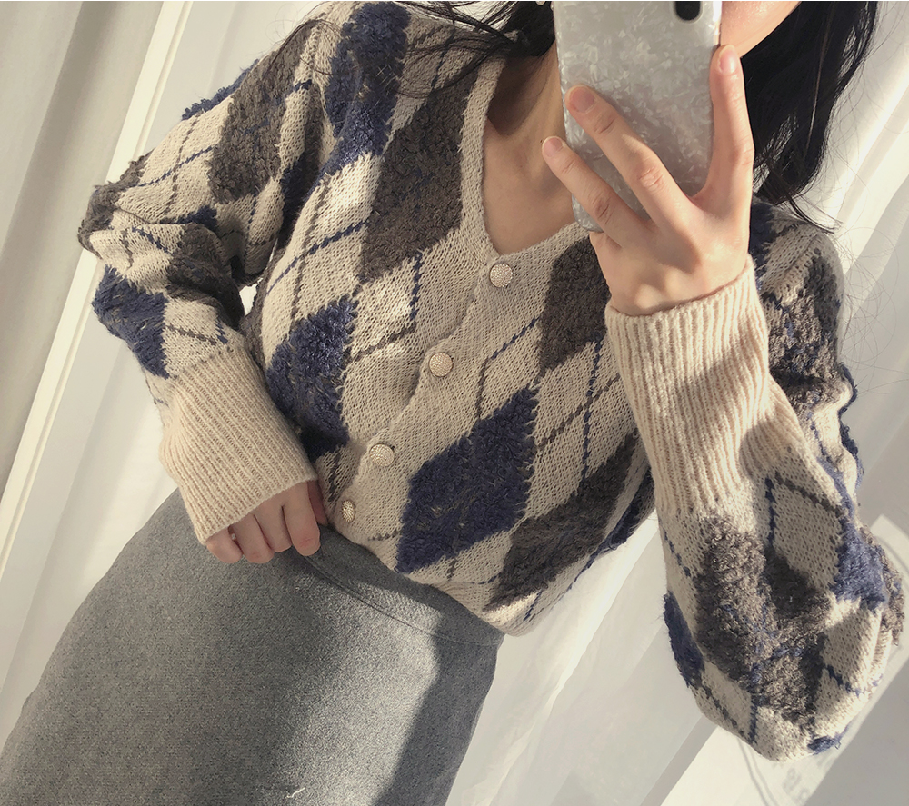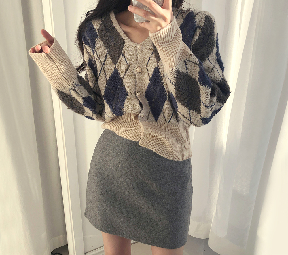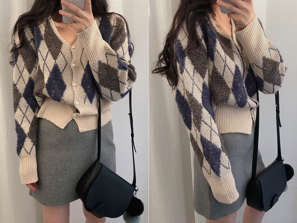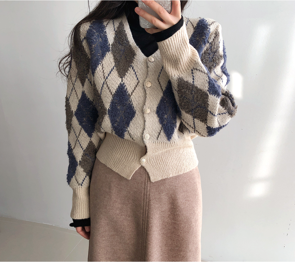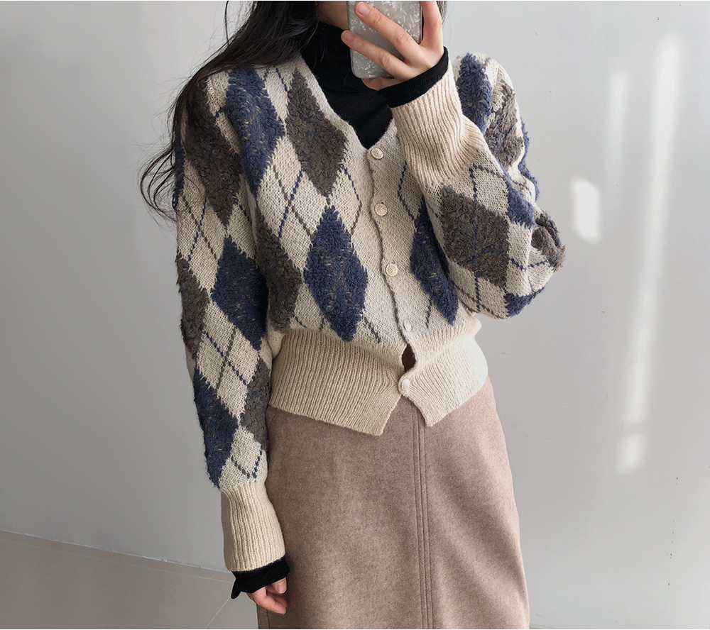 미니 아가일 브이 넥 니트 가디건