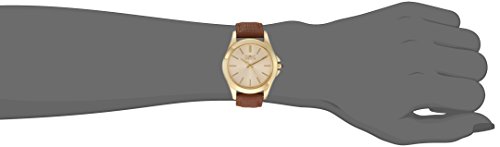 Round dress watch with brown leather band featuring gold-tone dial and bezel