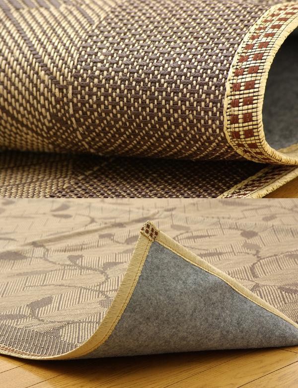 麻の一種であるジュート糸と、ポリエチレン糸のジャガード織のカーペットです。裏面にはフローリングを傷つけにくいよう不織布を貼っています。 |