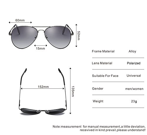 -. Feature : TAC POLARIZED LENS- 100% UV400 protection coating, blocks 100% harmful UVA & UVB Rays. Restore true color, eliminate reflected light and scattered light and protect eyes perfectly. TAC lens includes 7 layers. The 1st layer is polarization layer. The 2nd and 3rd layers are bonding layers to enable durability. The 4th and 5th layers are UV protection layers to absorb UV light. The 6th and 7th layers are shatterproof layers. / METAL FRAME: We use high graded metal as sunglasses frame, it is lightweight ,durable and solid. / PRODUCTS DIMENSION- Lens height:40 mm (1.57 inches); lens width:66mm (2.59 inches); leg length:140mm(5.51 inches); nose bridge:12-30 mm (0.47-1.18 inches); frame length: 140mm (5.51 inches). / GOOD LOOK, SUPERLIGHT, STYLISH, DURABLE AND CLEAR- Flattering lines & design features create aesthetically pleasing appearance. Lightweight design is ideal for motorcycle and cycling bicycle, driving, running, fishing, racing, skiing, climbing, trekking or other outdoor activities. Fashion and stylish design, with rich color combinations of frames and lens. Polycarbonate lens and frames are impact, scratch resistant and durable. Rimless jacket frame design enables clear lower vision field. / 30 DAY MONEY BACK GUARANTEE-100% satisfaction guaranteed. That is our promise. So, if you're not completely happy with your purchase within the first 30 days, just let us know. We will do whatever it takes to make it right