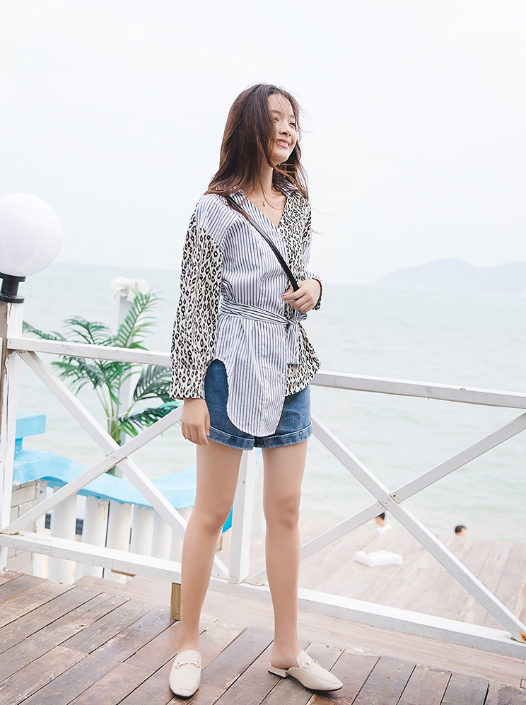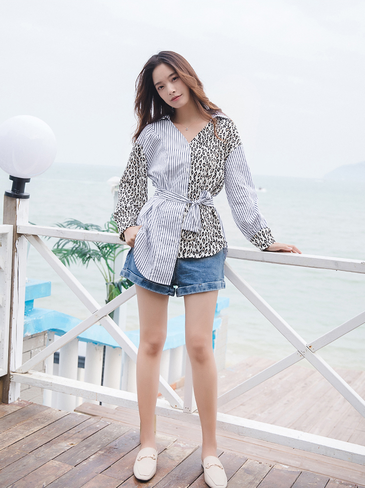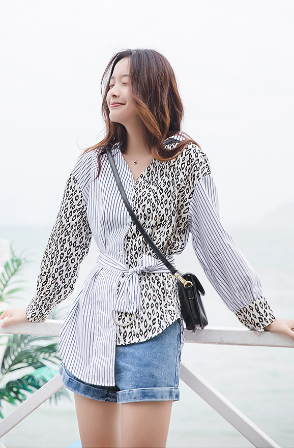 ヒョウ柄とストライプの組み合わせが印象的でセクシーな雰囲気の、長袖Vネックシャツです。