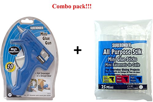 Mini high temperature glue guns are ideal for crafts, floral and do it yourself projects. Use high temperature for better bonding to metals, plastics and ceramic. Uses 4-Inch or 10-Inch glue sticks with 5/16-Inch diameter. Plug in cord for power and unplug immediately after use. Insert glue stick into the chamber, pull the trigger to advance glue. 10 watts, 120 volts.Feature
