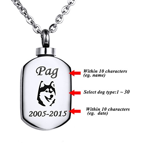 -. Binding : Jewelry -. Brand : Valyria -. Department : womens -. Feature : Waterproof Stainless Steel Pendant / Pendant size: Length:3.3cm(1 2/8");Width:2.5cm(1");Thickness:6mm( 2/8"); Chain length:56cm/22inch / Comes with Beautiful VELVET GIFT BOX and FUNNEL KIT.Each item packaged seperately! / Beautiful keepsake pendant contains a cavity which can be filled with your lover's ashes, hair, keepsake on it. Keep your lover's memory close to your heart always. / IMPORTANT!! Choose and tell us the pet dog from 1-30 at the third picture. Then Click CUSTOMIZE NOW to add your personalization details to this pendant,You may include 2 lines of text on back surface.Add to cart ONLY AFTER you have completed back surface with your information. -. Label : VALYRIA -. Manufacturer : VALYRIA -. Model : WBKL0225A -. MPN : WBKL0225A -. PartNumber : WBKL0225A -. ProductGroup : Jewelry -. ProductTypeName : FASHIONNECKLACEBRACELETANKLET -. Publisher : VALYRIA -. Studio : VALYRIA -. Title : VALYRIA Polished Blank Stamp Charm Urn Pendant Necklace Memorial Ash Keepsake with Personalized Engraving