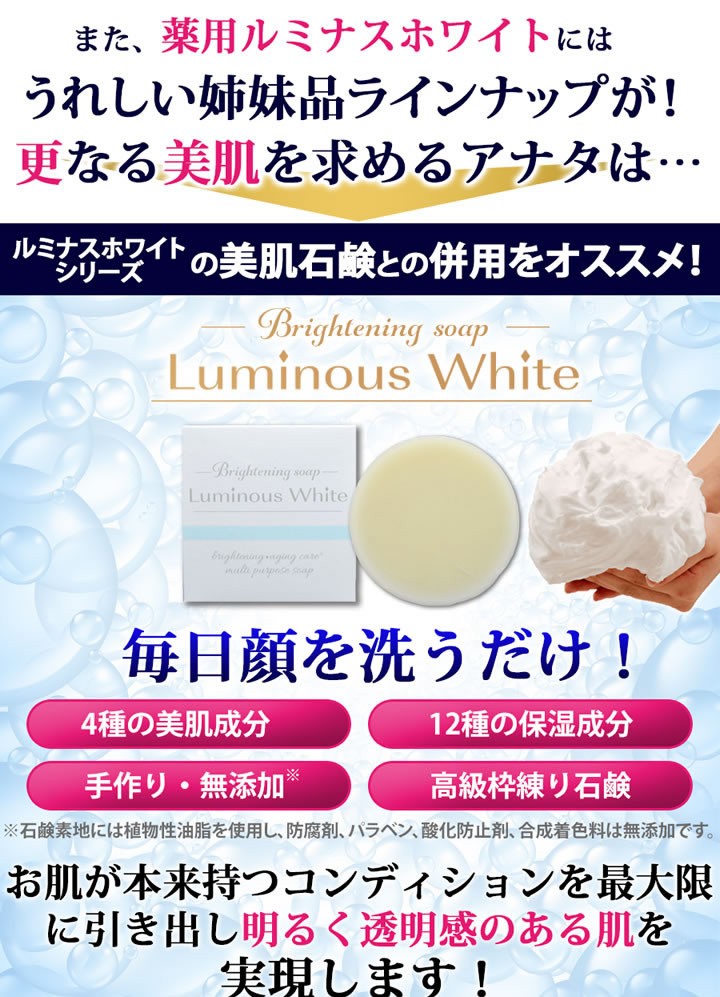 | 商品名 | Brightning soap LuminusWhite(ブライトニングソープ ルミナスホワイト) |