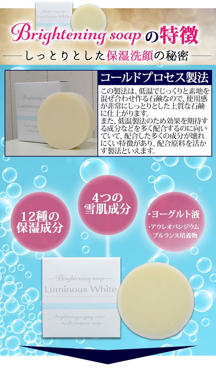 | 全成分 | カリ含有石ケン素地、水、アルブチン、ハイドロキノン、クズ根エキス、プラセンタエキス、ヨーグルト液(牛乳)、アウレオバシジウムプルランス培養物、ニンニク根エキス、ローマカミツレ花エキス、ゴボウ根エキス、アルニカ花エキス、セイヨウキズタ葉/茎エキス、オドリコソウ花/葉/茎エキス、オランダガラシ葉/茎エキス、セイヨウアマカツ球根エキス、ローズマリー葉エキス、アロベラ葉エキス、コメヌカ油、オリーブ果実油、香料、BG、エタノール |
