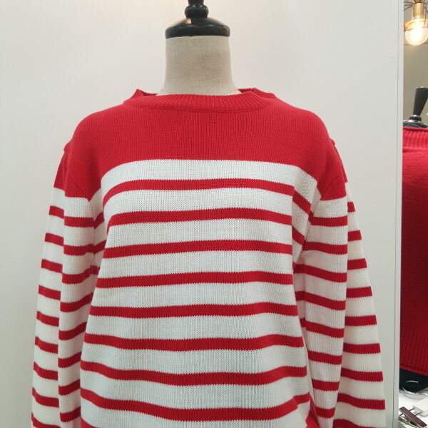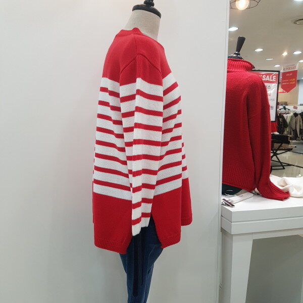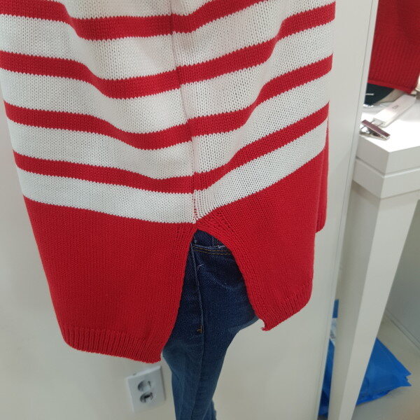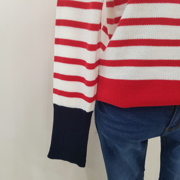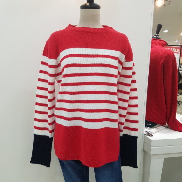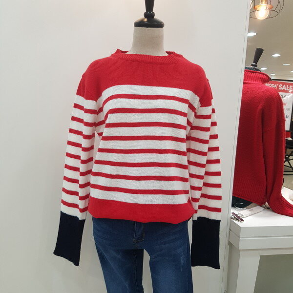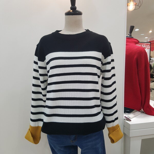 기본필수아이템인 줄무늬니트에배색소매를더해 귀여운느낌을줍니다