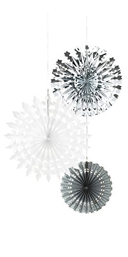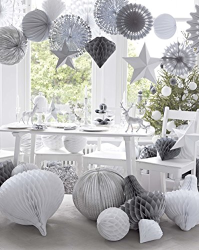 Studio : Talking Tables Publisher : Talking Tables Binding : Kitchen Product Description A marvelous combination of tissue and foil, this charming hanging snowflake decoration is perfect for the festive period. These gorgeous hanging paper decorations are ideal placed above your windows or hung over the mantelpiece. Each pack includes 3 different shaped and sized paper fans in white, grey and foil silver designs. Combine this delightful display with other festive hanging decorations from the Talking Tables Modern Metallic range. 0