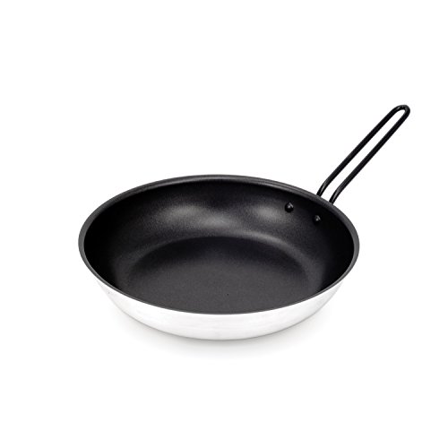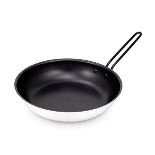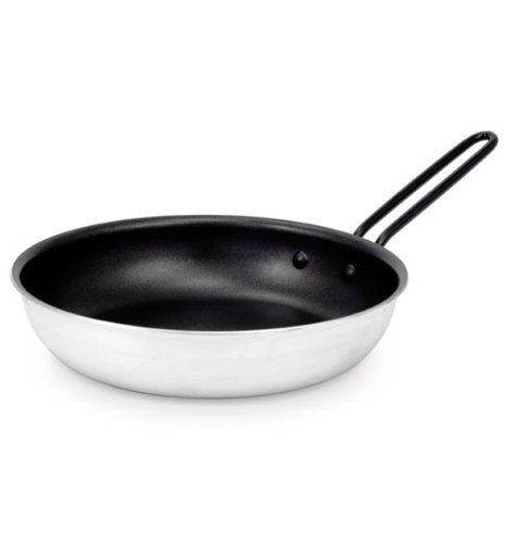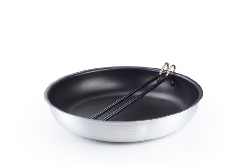 Amazon.com Product Description Hit the campsite with confidence with the GSI Bugaboo frypan, a dependable nonstick option for all your outdoor cooking needs. This high-quality aluminum pan is light enough for backpacking, yet heats evenly enough to satisfy even the most demanding camp cook. Plus, the pan is fully formed and then coated with two layers of durable nonstick material, creating additional scratch resistance. Other details include a spiral-turned base that grips stoves and grills securely, a fixed helper handle, and a removable primary handle. The Bugaboo frypan comes in three sizes--8 inches, 10 inches, and 14 inches--and weighs between 11.4 ounces (small) and 3 pounds 4 ounces (large).