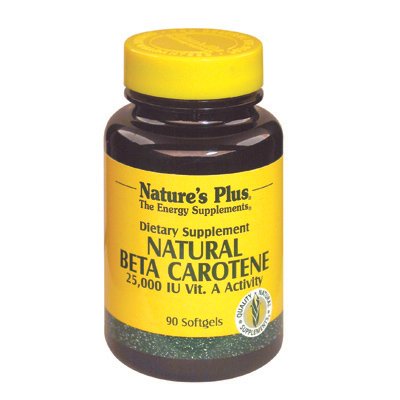Natural Beta Carotene 90 SoftgelProduct DescriptionNatural Beta Carotene From Dunaliella salina algae. Nature's Plus Natural Beta Carotene Softgels contain 25,000 IU of Vitamin A activity and no chemicals or preservatives are used in production. Dunaliella salina is a single-celled algae, cultivated in seawater or salt lakes, producing 10,000 times more Beta Carotene than carrot cells.