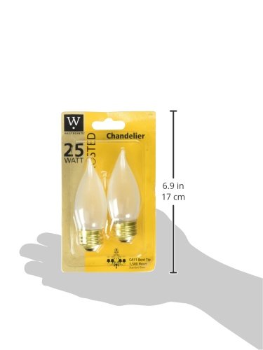Product DescriptionWestport, 25ca11/F/CD, 2 pack, 25W, 120V, frosted chandelier flame, bent tip light bulb, maximum overall length 4-D/4 inch standard base, 175 lumens, 2,500 hours, Carded.0