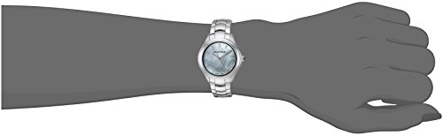 -. Feature : Silver-tone round watch featuring mother-of-pearl dial, applied tapered indices, and date window at 6 o'clock / 32mm stainless steel case with anti-reflective sapphire window / Swiss quartz movement with analog display / Three-link bracelet with push-button deployant clasp / Water resistant to 30m (100ft): in general, withstands splashes or brief immersion in water, but not suitable for swimming or bathing