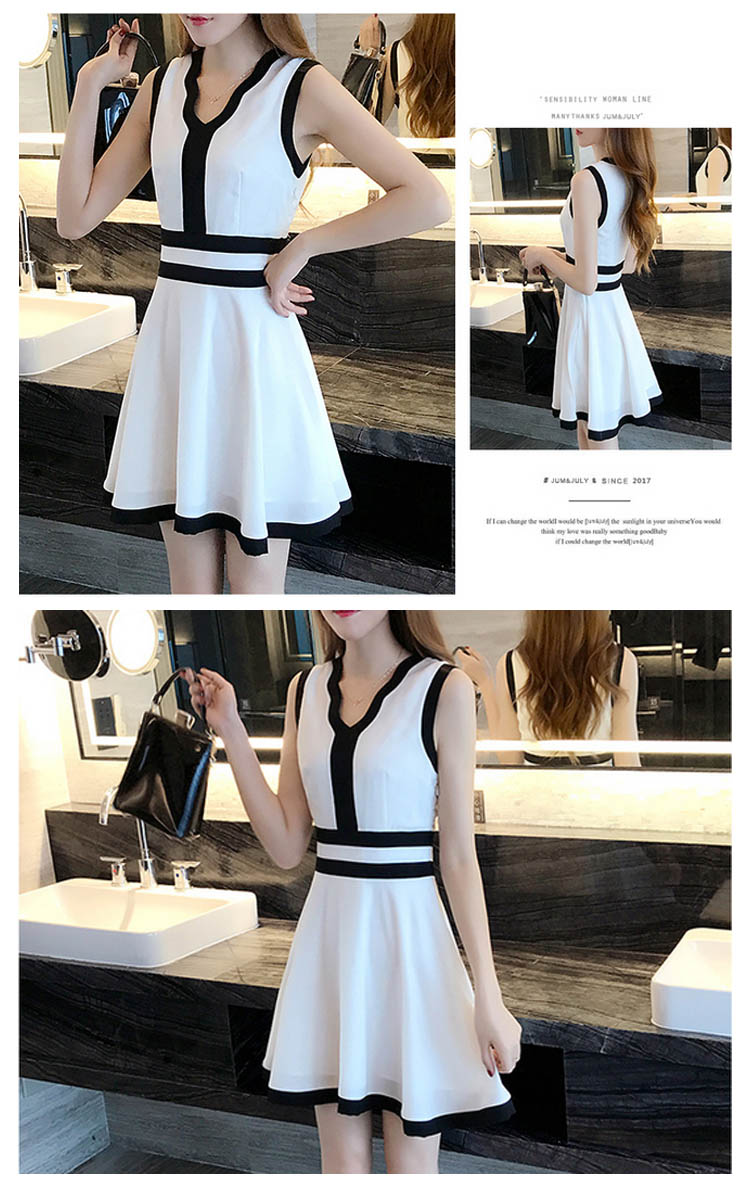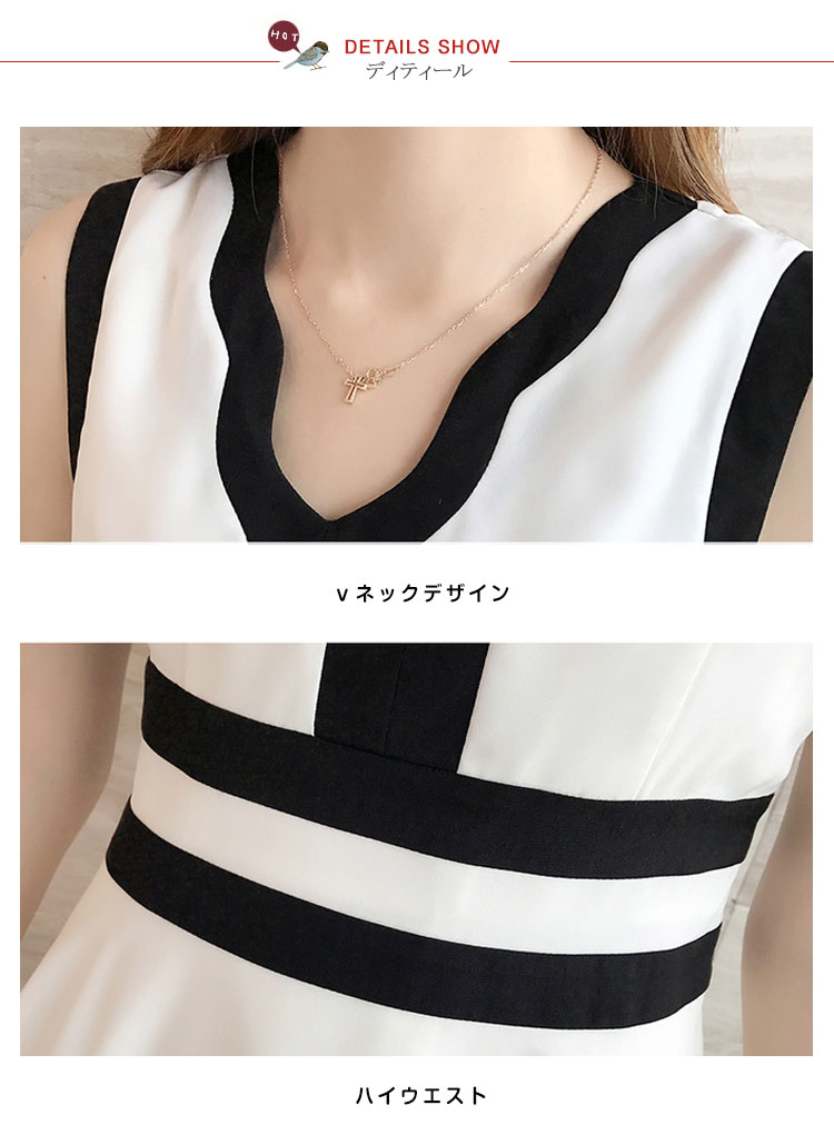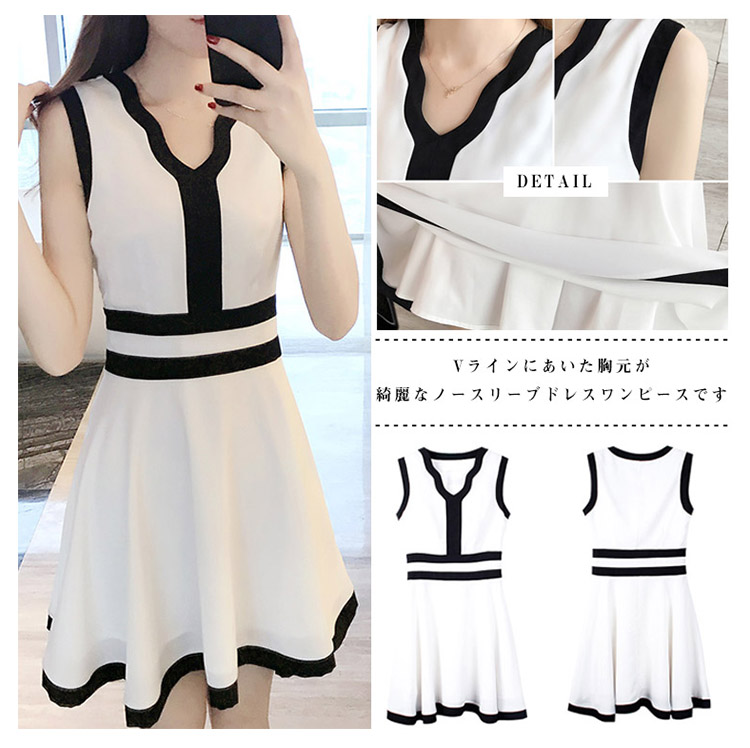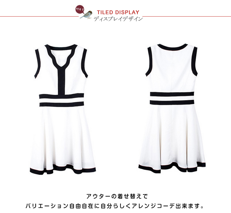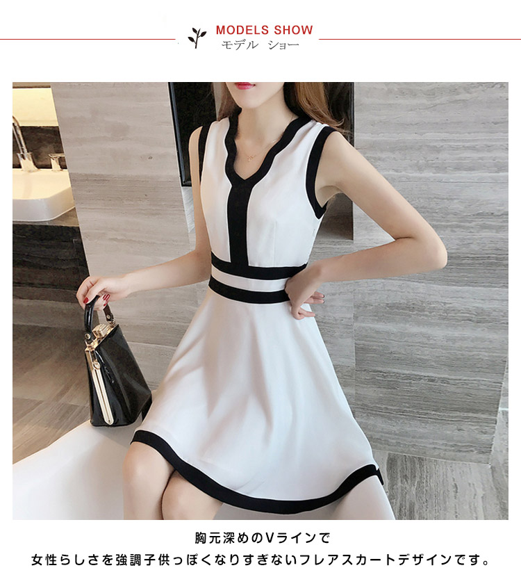 | Vラインにあいた胸元が綺麗なノースリーブドレスワンピースです胸元深めのVラインで女性らしさを強調子供っぽくなりすぎないフレアスカートデザインです。アウターの着せ替えでバリエーション自由自在に自分らしくアレンジコーデ出来ます。 | |