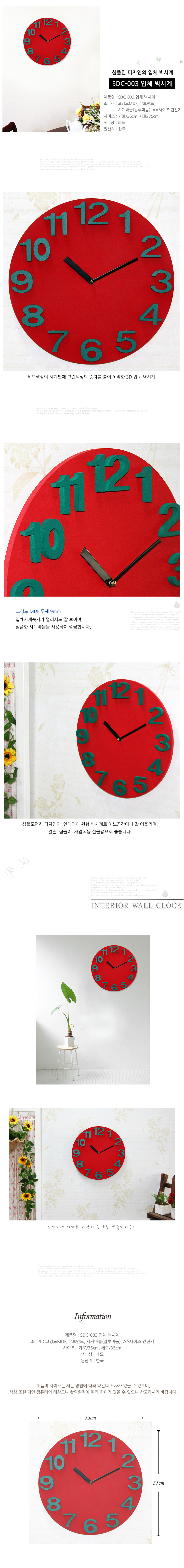 INFO Material : high-solidity MDF, Movement Size : 35cm x 35cm x 0.9cm Contents : Clock, AA Battery 1ea Origin : Korea