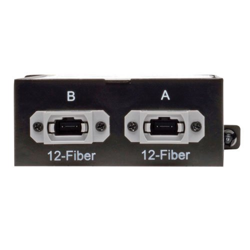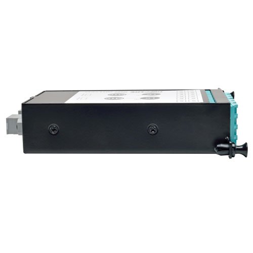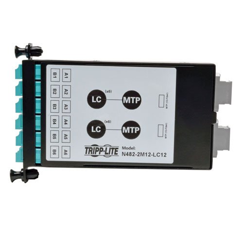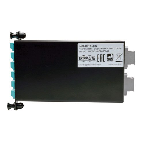 Tripp Lite's N482-2M12-LC12 is a High Density 40Gb to 10Gb Breakout Cassette, with (x12) LC connections to (x2) 12-Fiber MTP/MPO connections. For use with Tripp Lite's N482-01U and N482-02U High Density Fiber Enclosure Panels; up to 5 cassettes per N482-01U, or up to 14 cassettes per N482-02U. Installation is simple, with the cassette being easily installed or removed using push / pull tabs to lock or unlock it from the panel; no tools required. Furthermore, each cassette features factory terminated connectors that reduce the time and labor required of field connector terminations. Complies with IEEE 802.3ae (10Gbe) and ANSI T11.2 (Fibre Channel) requirements, with a maximum insertion loss of 0.35dB falling well under the IEEE 802.3ae maximum channel loss spec of <25dB. Constructed of heavy-duty steel housing. Key Features - High Density Fiber Cassette for use with Tripp Lite N482-01U and N482-02U High Density Fiber Enclosure Panels