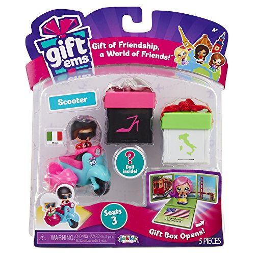 -. Feature : Scoot around town and explore on the new Gift'ems Scooter / Exclusive Italy Gift'em couple / Seats up to 3 Gift'ems / Includes: -1 Scooter - 2 Exclsuive Giftems Dolls (1 Girl & 1 Boy) - 2 Gift Boxes -1 Collector poster / Designed for kids ages 4+