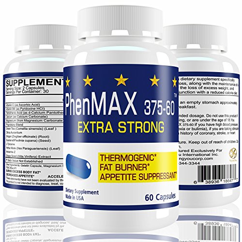 -. Feature : PhenMax375 Diet Pills are an Ultra-Strong Fat Burner, Energy Enhancer, and Appetite Suppressant. Two pills a day will help to burn fat, reduce appetite and elevate mood. / PhenMax diet pills will help you to improve your metabolism, and burn body fat naturally. You will lose weight much faster and easier with PhenMax weight loss pills than with diet and exercise alone. / PhenMax 375 is specially designed to have a powerful thermogenic effect, using a combination of all-natural ingredients such as Garcinia Cambogia and Guarana to maximize its impact as a fat burner so as to get rid of stored body fat. / As an appetite suppressant, PhenMax 375 uses Caralluma Fimbriata to help you be satisfied with smaller portions and to reduce cravings. Reducing your caloric intake is essential for a successful weight loss program, and PhenMax gives you the ability to do that in a consistent and healthy way. / As a mood enhancer, PhenMax 375 contains L-carnitine, which helps the body to maintain energy and is important for healthy heart and brain function. It also has Phenylethylamine (PEA), a naturally occurring alkaloid which works as a neurotransmitter and serves to elevate mood and promote feelings of well-being. Together, they can help you to have a positive mental attitude and sustained focus and energy.