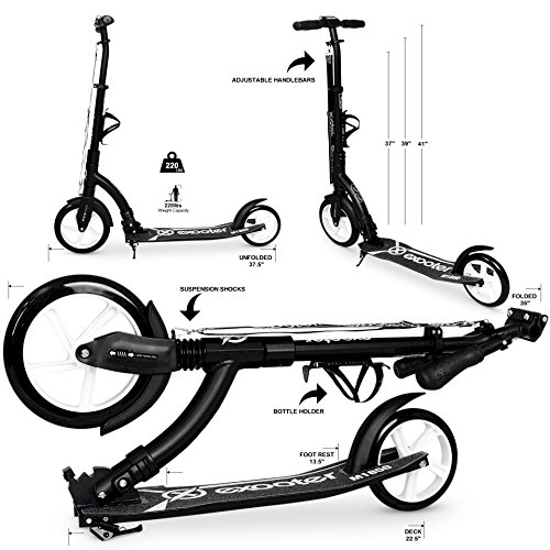 Feature : Absorbent: 220lbs weight capacity with front suspension shocks. Design: Compact folding for easy transportation with carrying strap. Lightweight: 11.5lbs solid and sturdy all aluminum frame and deck. Feature: Solid spring-shock kick stand for easy folding and unfolding. Bonus: Sleek self adjustable bottle holder for up to 32oz beverage. Performance: 180mm/240mm wheels, ideal for city uneven pavement. Pitching: Quick and easy folding and unfolding spring system with lock.