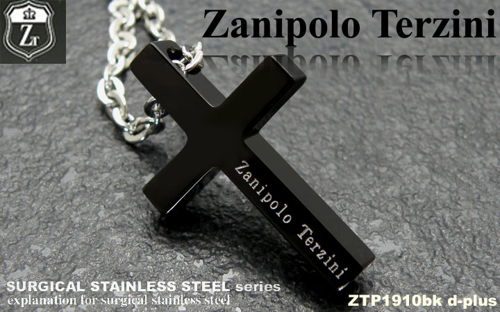 最新作!!ブラックコーティングを施したクロスタイプのペンダントトップ。 定番のクロスデザインは、永く使える万能アイテム! 薄着の季節はカラーアクセで周りと差をつけよう☆ 40?45cmアジャスター付チェーンがセットになっています。 ■サイズ:H=22.5mm x W=14.5mm     ■カラー:IPブラックコーティング     ■付属品:ステンレスチェーン(45cm+5cmアジャスター)、Zanipolo Terziniオリジナルポーチ
