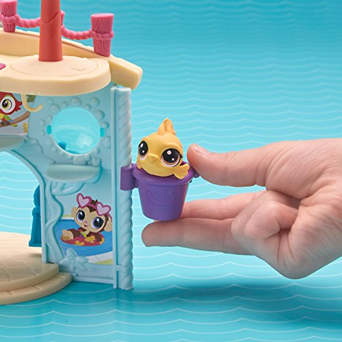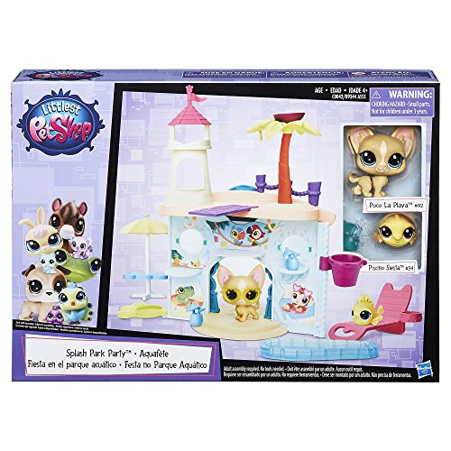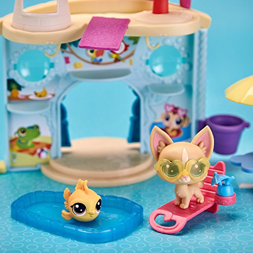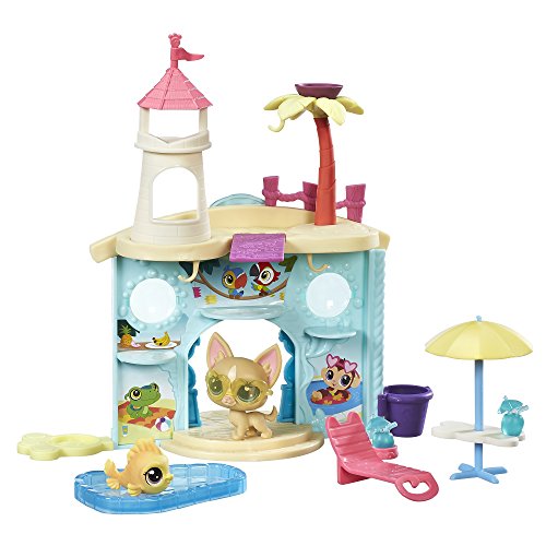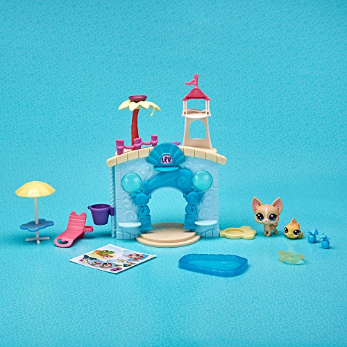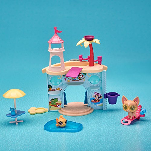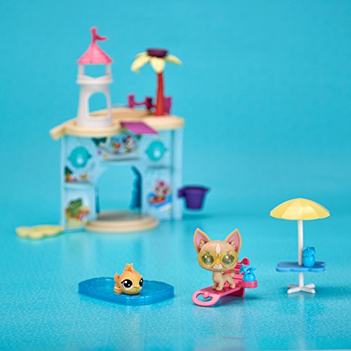 What's more fun than partying with friends, pool-side? With this aquatic-themed playset, kids can pretend pets are enjoying a day swimming and having a great time! Featuring a fun-loving Chihuahua (#92 Poco La Playa) and a fish (#54 Piscino Siesta), this playset has room to play with and display a total of 15 pets (additional pets sold separately). Fun features include an elevator to take pets up to the roof of the castle – it's perfect for catching some rays – and a diving board, too! There's also a table, lounge chair, drinks, and pool – it's fun to pretend that pets can wade or sit in the shade all day long! Littlest Pet Shop and all related characters are trademarks of Hasbro.Feature