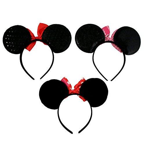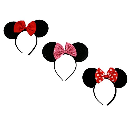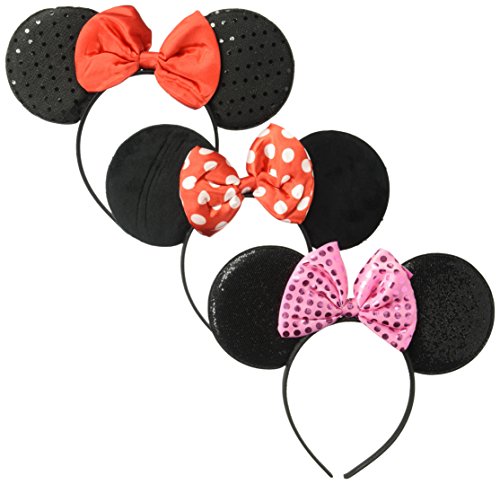 Young girls can share Minnie's passion for fashion and love of bows with this playful three-piece set of Minnie Mouse headbands. Headbands are covered in satin fabric for added comfort and feature black dimensional poly filled ears. Each headband features a unique cover and bow so she can change up looks with ease. One has a shiny disco dot cover and attached red satin bow, a second one has a velour cover and attached red satin bow with white polka dots, and a third has a glitter fabric cover and attached pink satin bow with shiny purple disco dots. Designed to comfortable fit big girls aged 7 to 14, girls can add an element of sweet, fun-loving Minnie to their outfit or costume. Bring a touch of Disney magic to her accessory collection and create memorable childhood moments with this Minnie Mouse headband set displaying Minnie's flair for fun and fashion.Feature